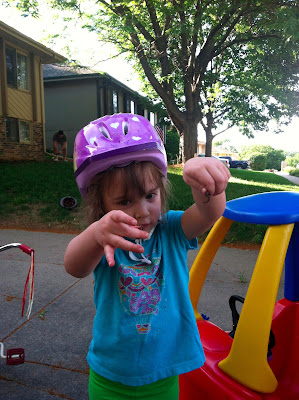 Daddy found a worm in the dirt as he was digging around. Miss Jane thought "Squirmy" (her name for the worm) was the coolest guy ever! Unfortunately, Squirmy got stuck to the metal on Jane's trike handle bar and split in two. Without skipping a beat, Jane held up both halves of Squirmy and said, "Cool! Look! Now I have 2 Squirmies!"